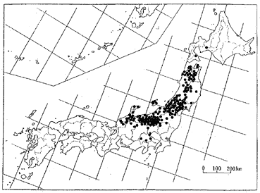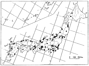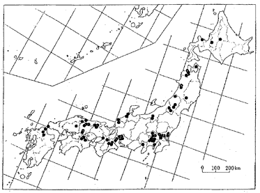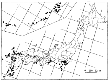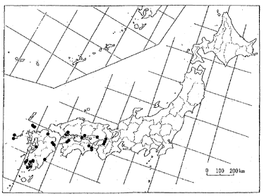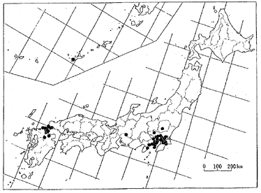 (○印で示した産地のうち、屋久島・長崎は正確な地名不詳。広島・大阪・京都 ・奈良・愛知・秋田の各産地は同定に疑問あり。共に再検討が必要)